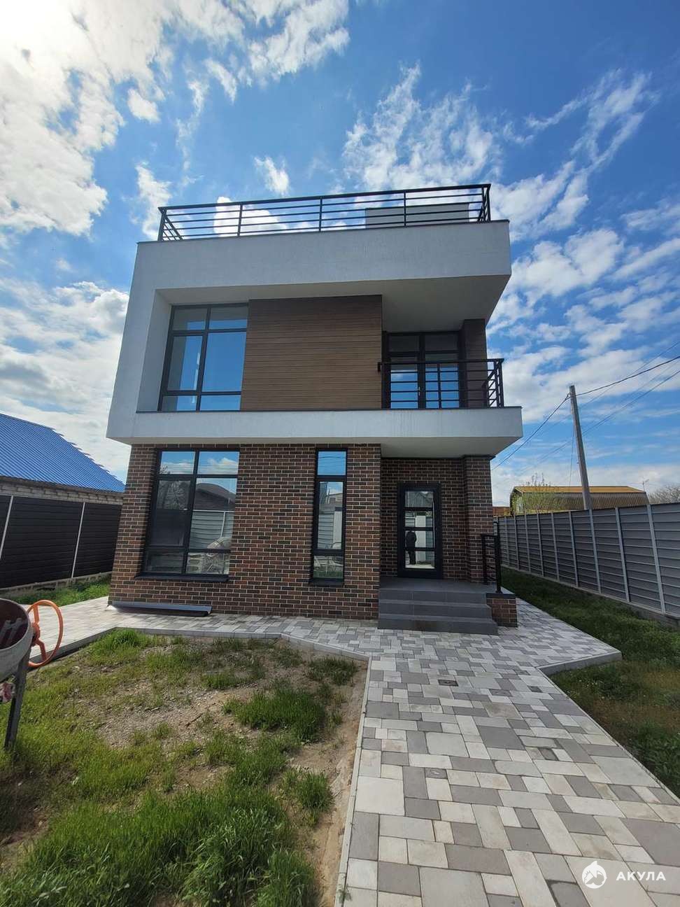 Материал стен- керамический целевой кирпич. Первый этаж утеплен фасадным пенополистиролом с отделкой кирпича " Баварская кладка". На втором этаже комбинация штукатурки к имитации дерева. Большая часть окон на фасаде предусмотрены в витражном исполнении до пола.